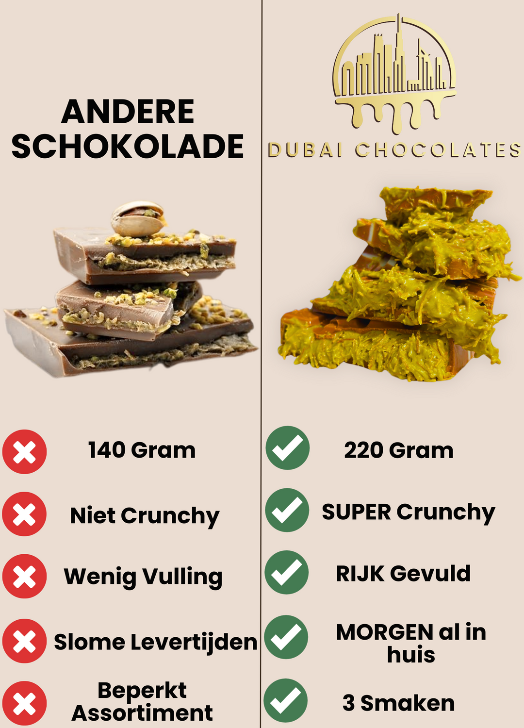 Naše originální Dubai chocolate, známá také jako Dubajská čokoláda, není jen obyčejná sladkost — je to zážitek. Každé sousto nabízí dokonalou rovnováhu mezi křupavostí a jemností. Objednejte do23:59 a odešleme vám ji ještě dnes!